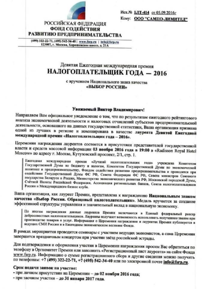- В 2015 году ООО «САМПО-ЛИМИТЕД» признана одной из лучших в регионе и номинирована в качестве лауреата Восьмой Ежегодной международной премии «Элита национальной экономики — 2015» подробнее о награде.